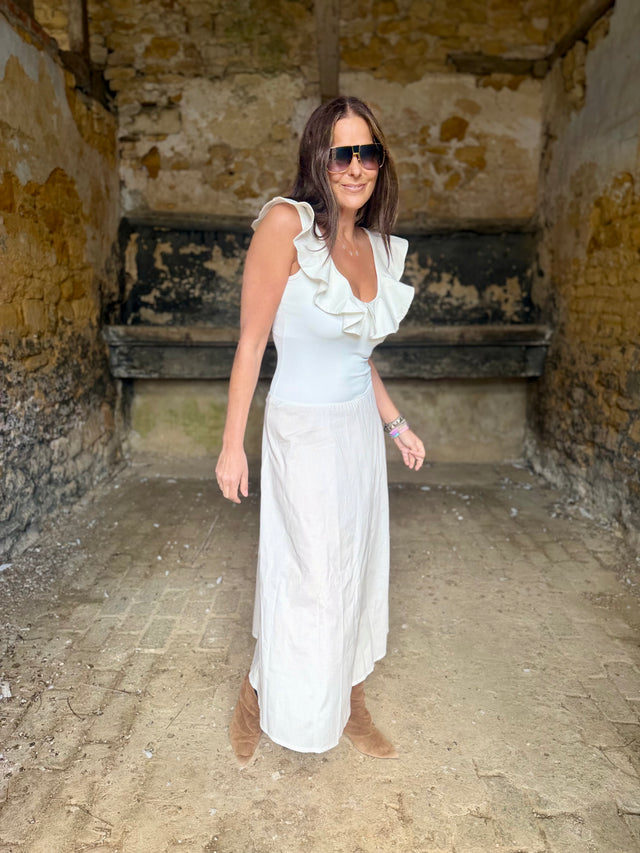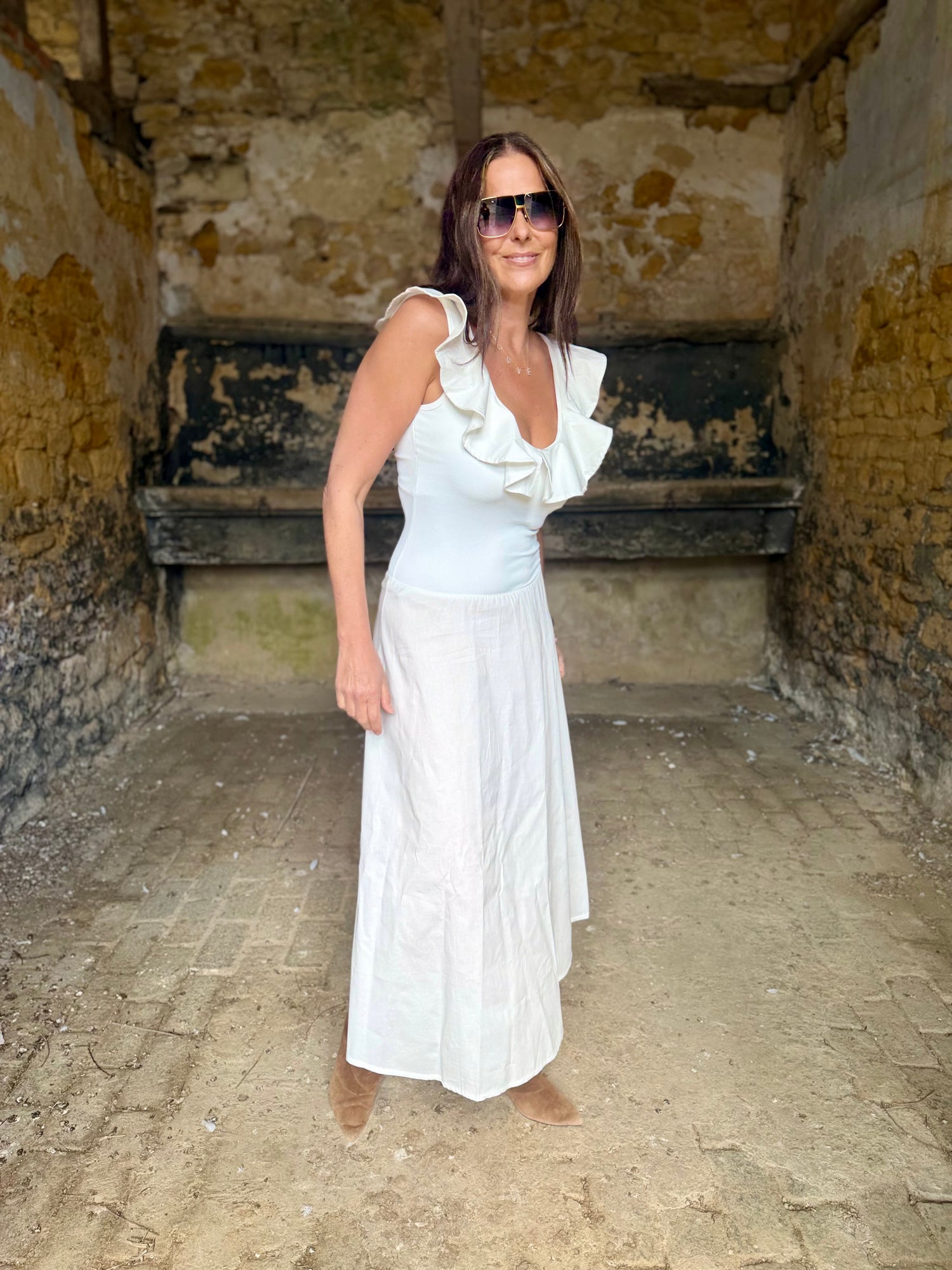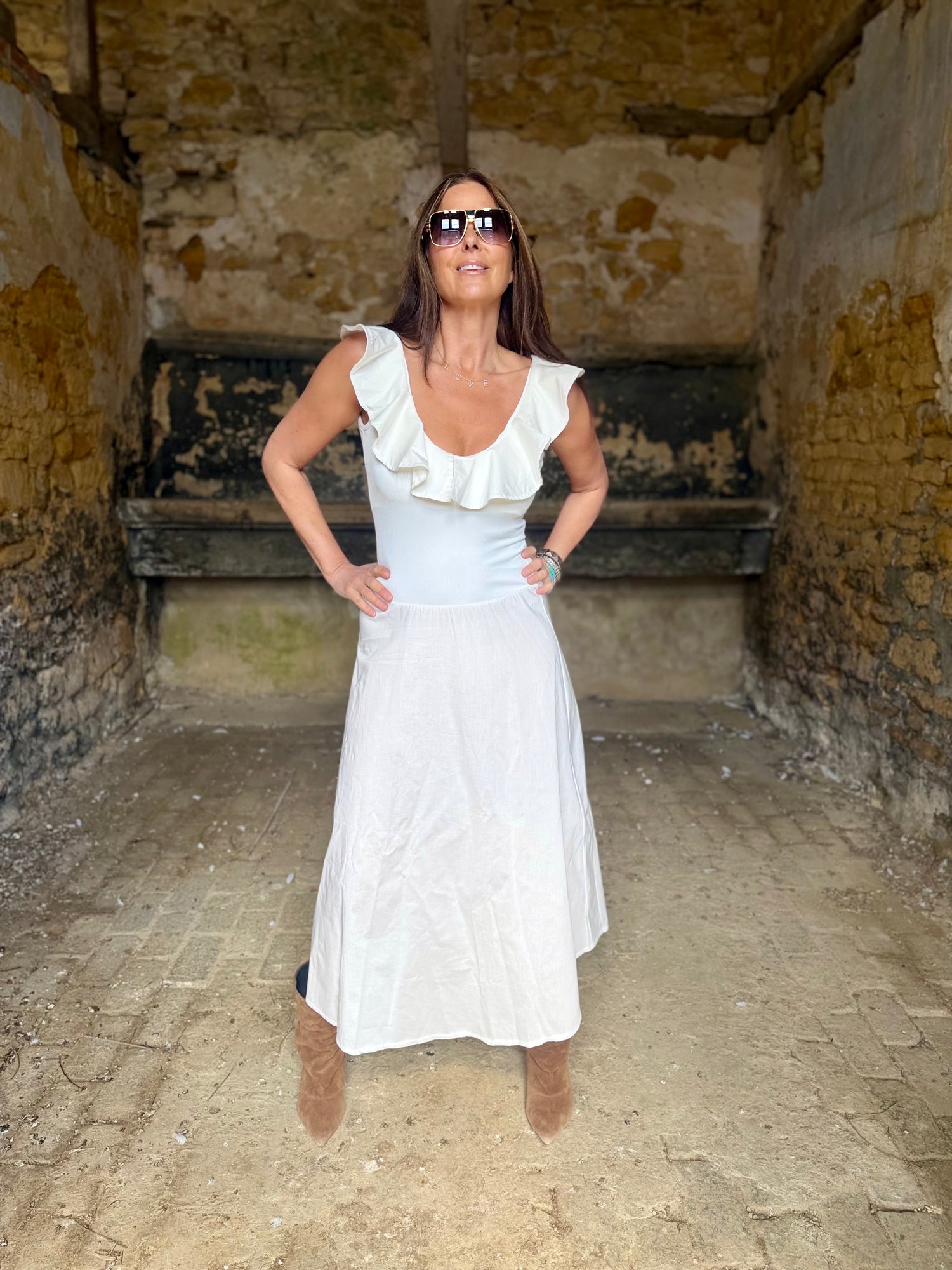 The Jenna Ruffle Strap Dress is a versatile day-to-night essential that captures the same effortless elegance as our beloved April Dress. Featuring a stretchy, supportive torso that moves with you and a lightweight, flowing skirt. The delicate ruffle straps add a touch of feminine detail, also available in three stunning colours, the Jenna is the modern wardrobe staple you'll reach for again and again.