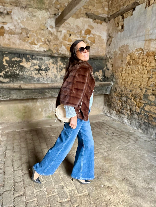 The Ygritte Cape in Espresso offers a luxurious faux fur finish with a sleek zip-up front for ease and style. Designed with short sleeves, it provides a versatile layering option that combines warmth and elegance. Available in two colors, this expertly crafted piece has been restocked to meet high demand, making it a refined addition to any wardrobe.