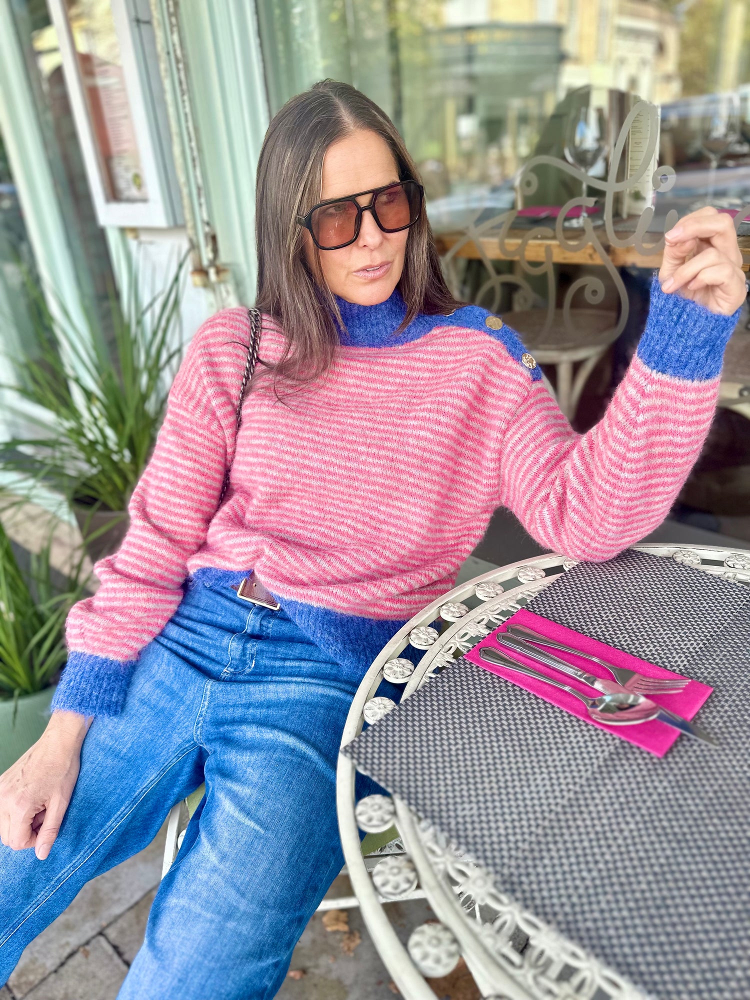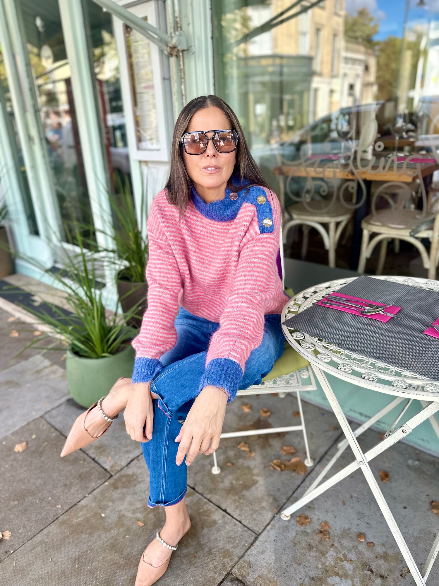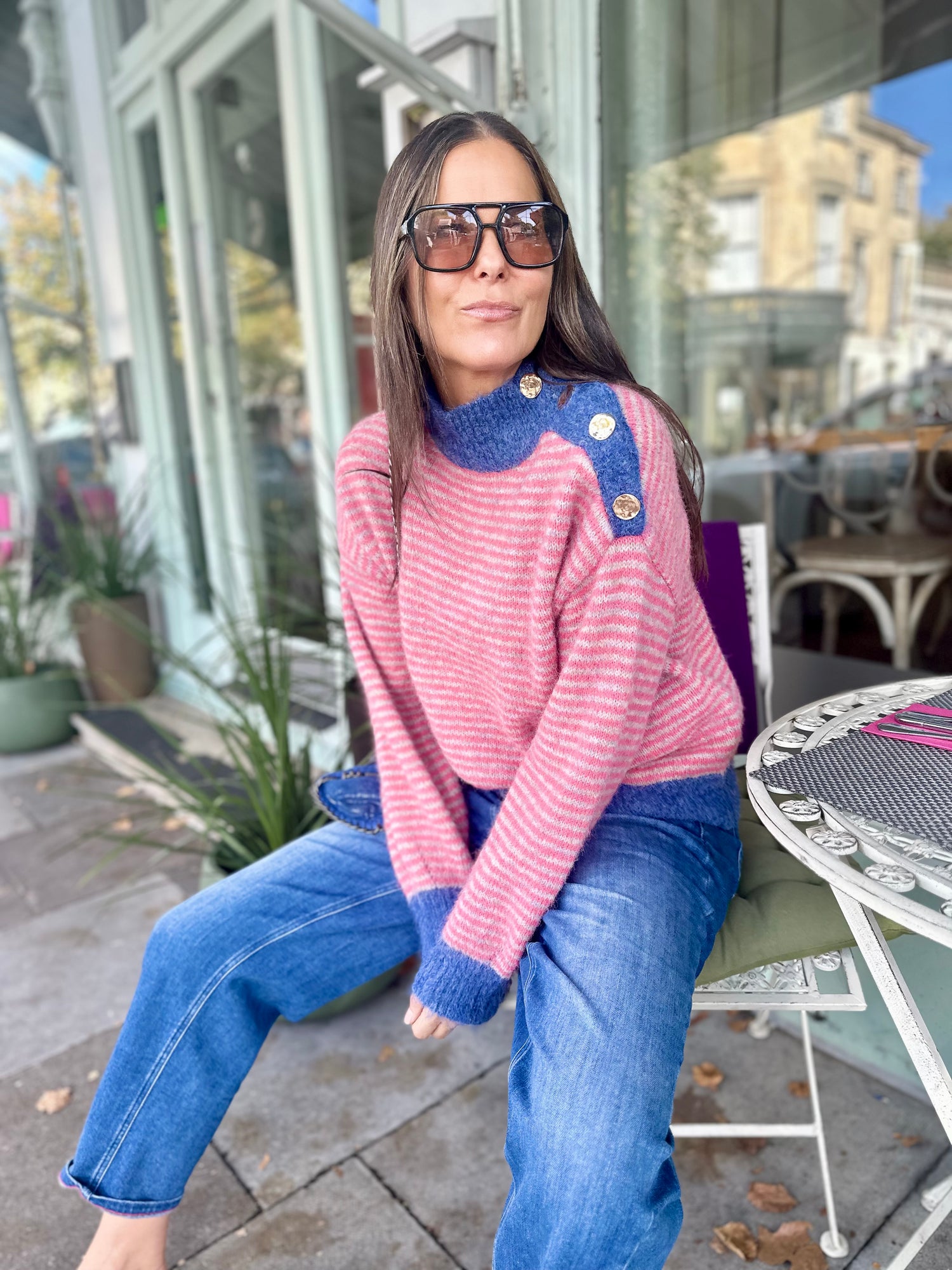 The Alaia Knit with Buttons offers a refined winter essential available in three distinctive colourways. Featuring elegant stripes and a subtle gold button detail, this knit provides both style and warmth. Its design balances sophistication with comfort, making it an ideal layering piece to elevate your seasonal wardrobe effortlessly.