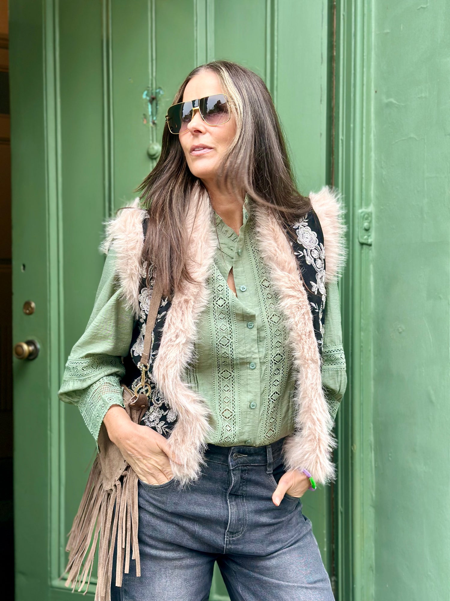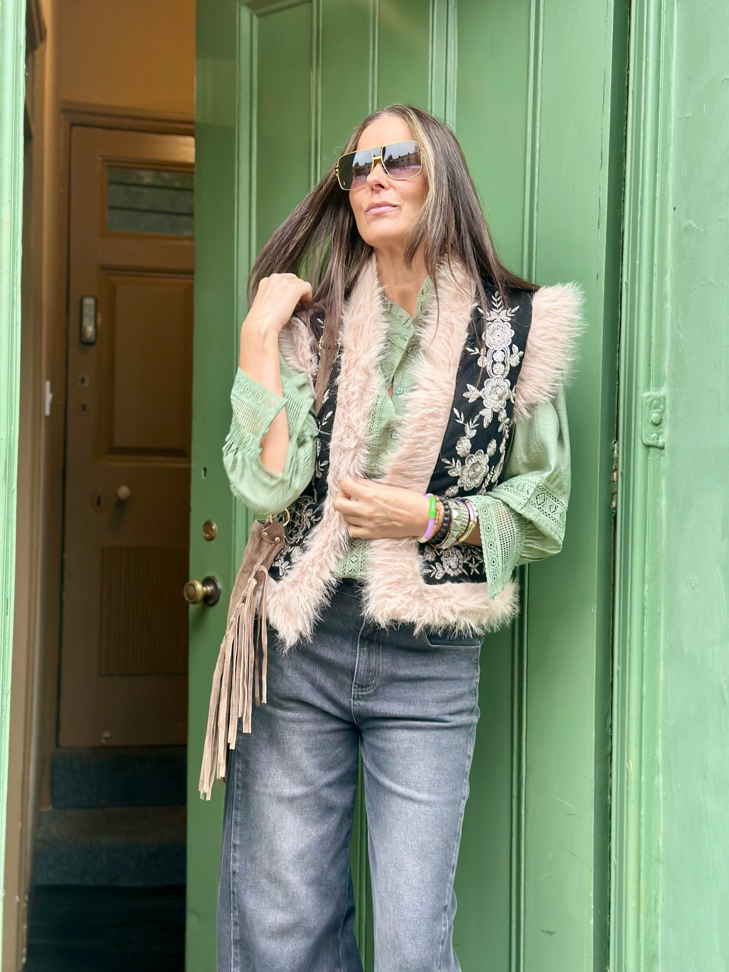 The Karolina Gilet features a luxurious fur finish that adds warmth and sophistication. Expertly embellished and adorned with intricate embroidery, this piece combines refined craftsmanship with stylish detail, making it a standout addition for cooler seasons. Its elegant design ensures both comfort and a polished look.