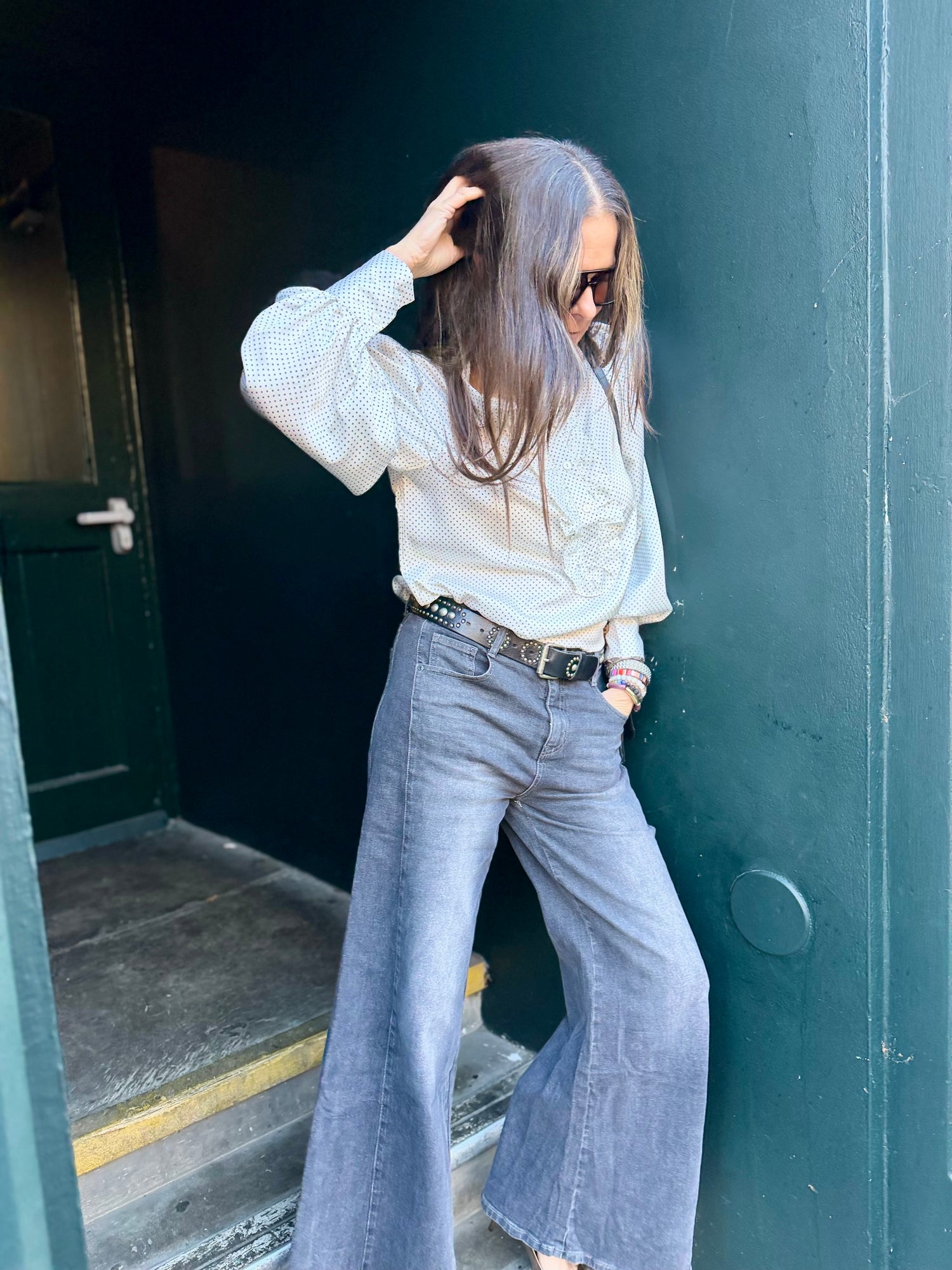 The Maisie Shirt features a classic polka dot pattern with a distinctive ruffle detail running down the center for added texture and style. It is finished with a neat collar and button-down front, combining timeless elegance with subtle feminine touches, perfect for both professional and casual settings.