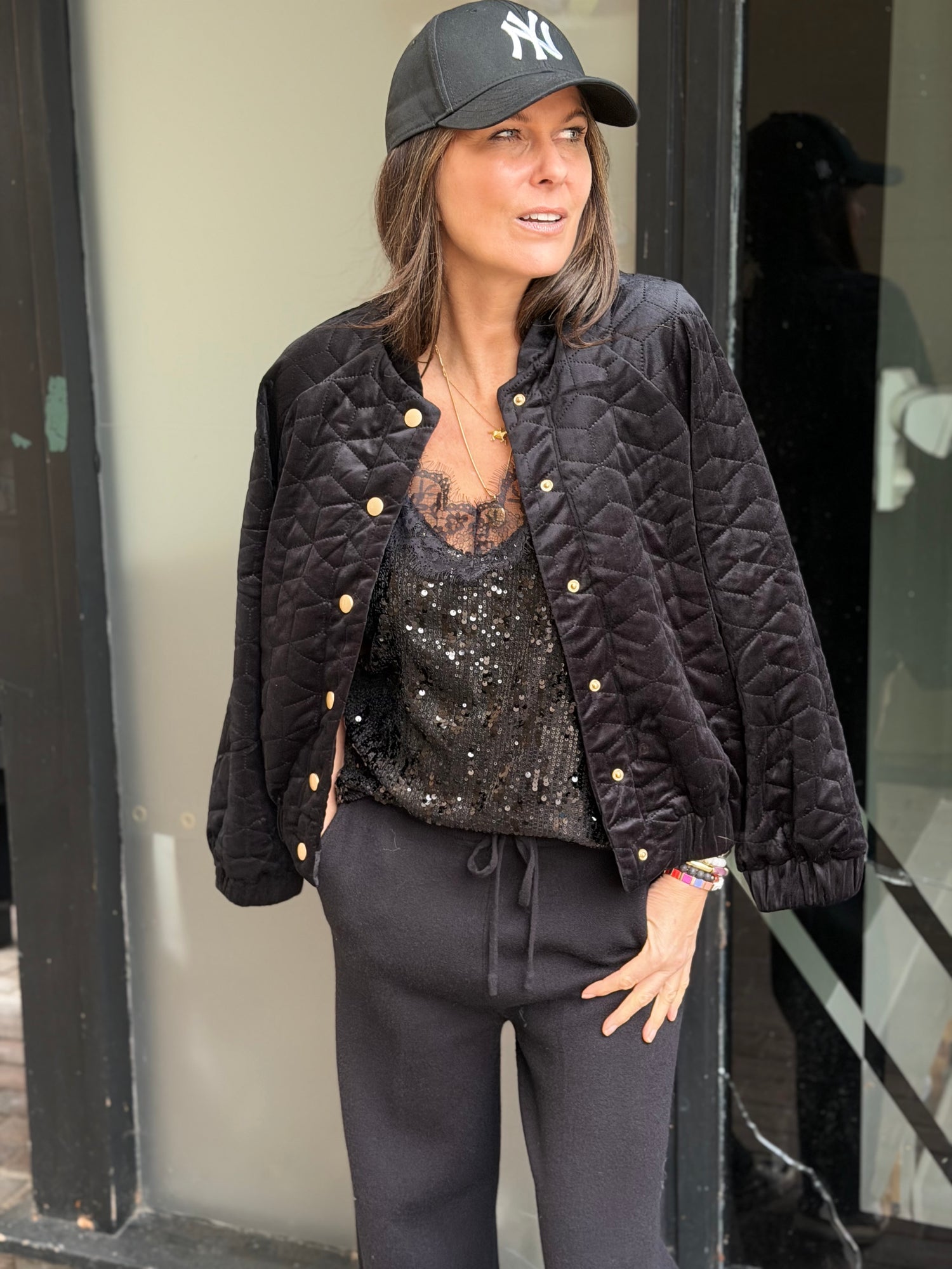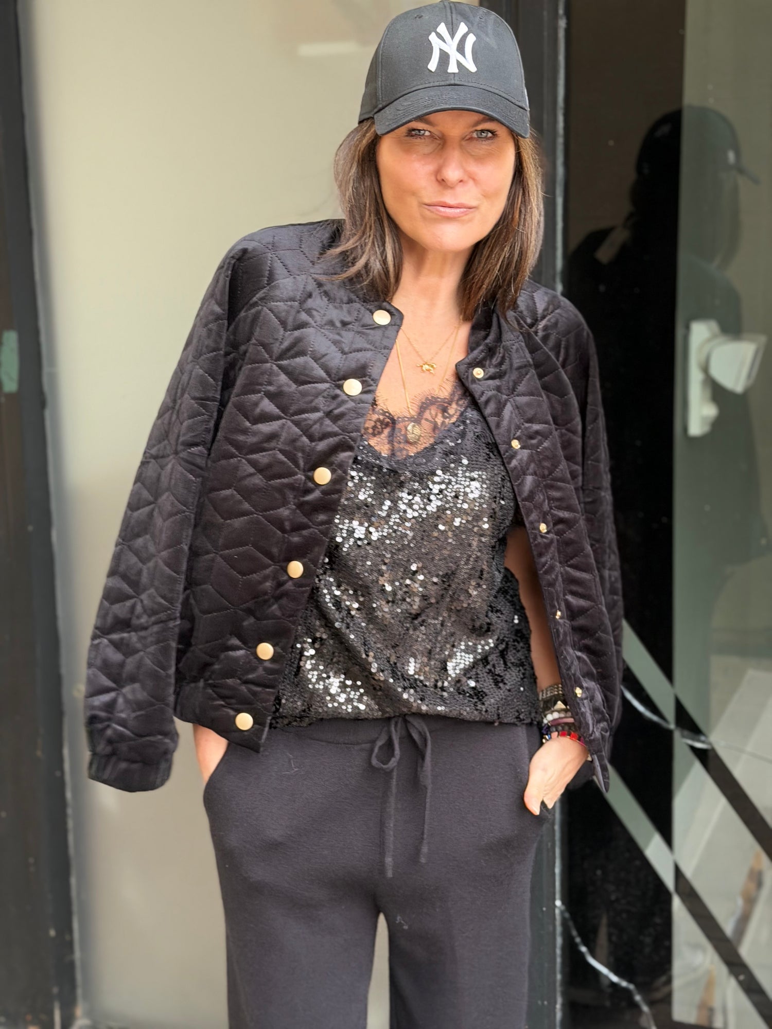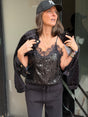 A shimmering sequin cami with delicate lace trim, designed to dress up or down with ease. Perfect for layering or solo styling, it transitions effortlessly from day to night.