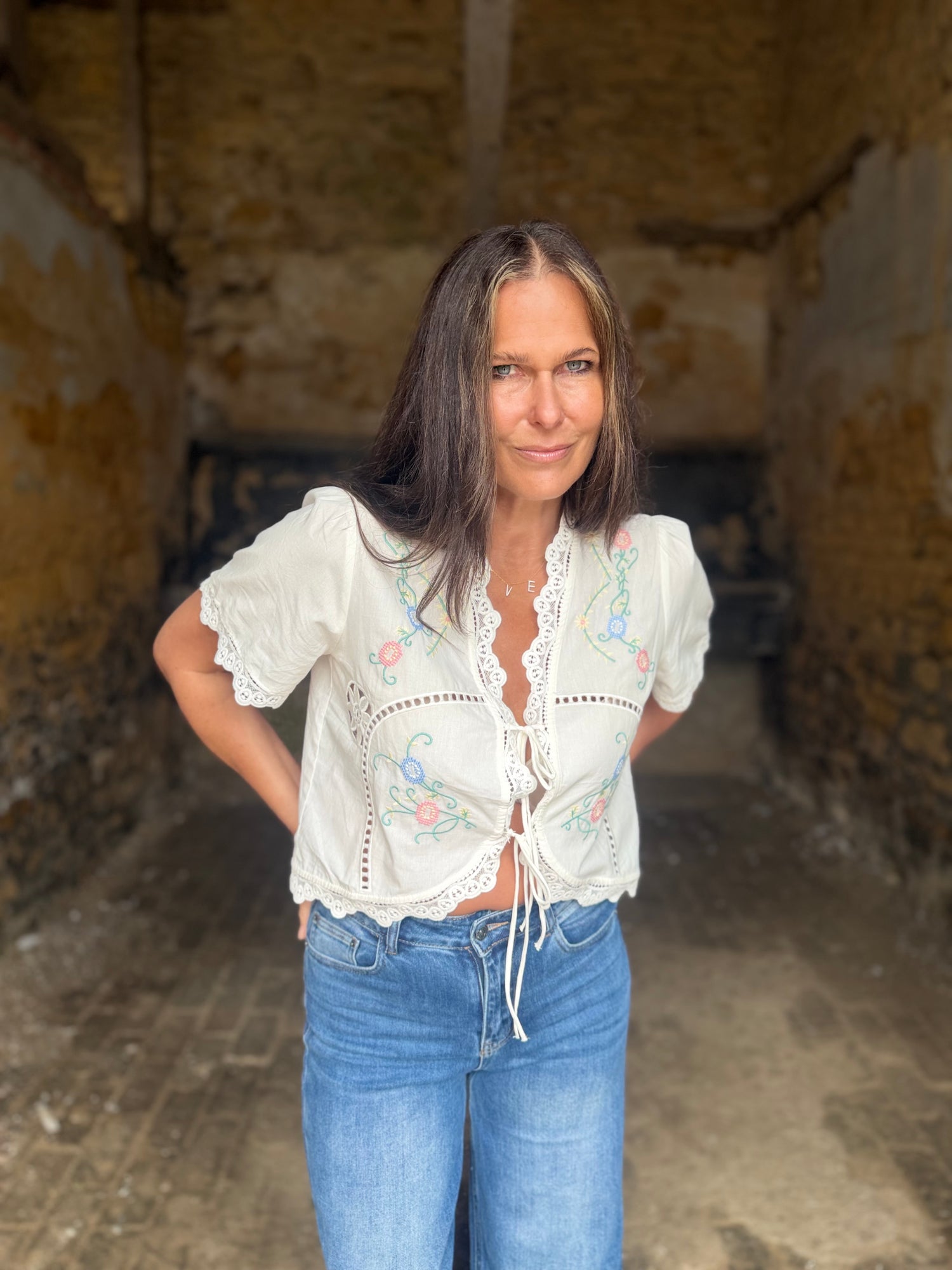 The Muse Tie Blouse combines contemporary design with refined craftsmanship. This short-sleeve piece features strategic cut-out detailing that adds visual interest and movement, while delicate embroidery work elevates the neckline and shoulders. The tie closure at the front creates a flattering silhouette and allows for adjustable styling. Available in two sophisticated colourways.