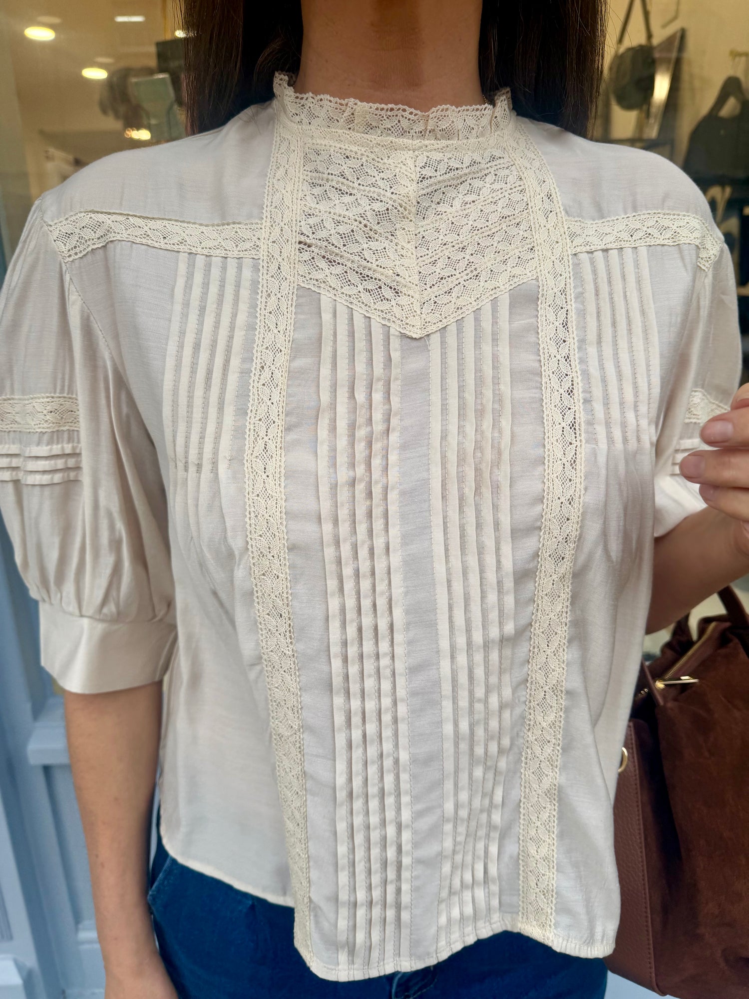 Short-sleeve blouse with intricate embroidery and a high neckline, drawing inspiration from vintage design codes. Offered in two complementary colours, this piece delivers understated sophistication with bohemian charm.
