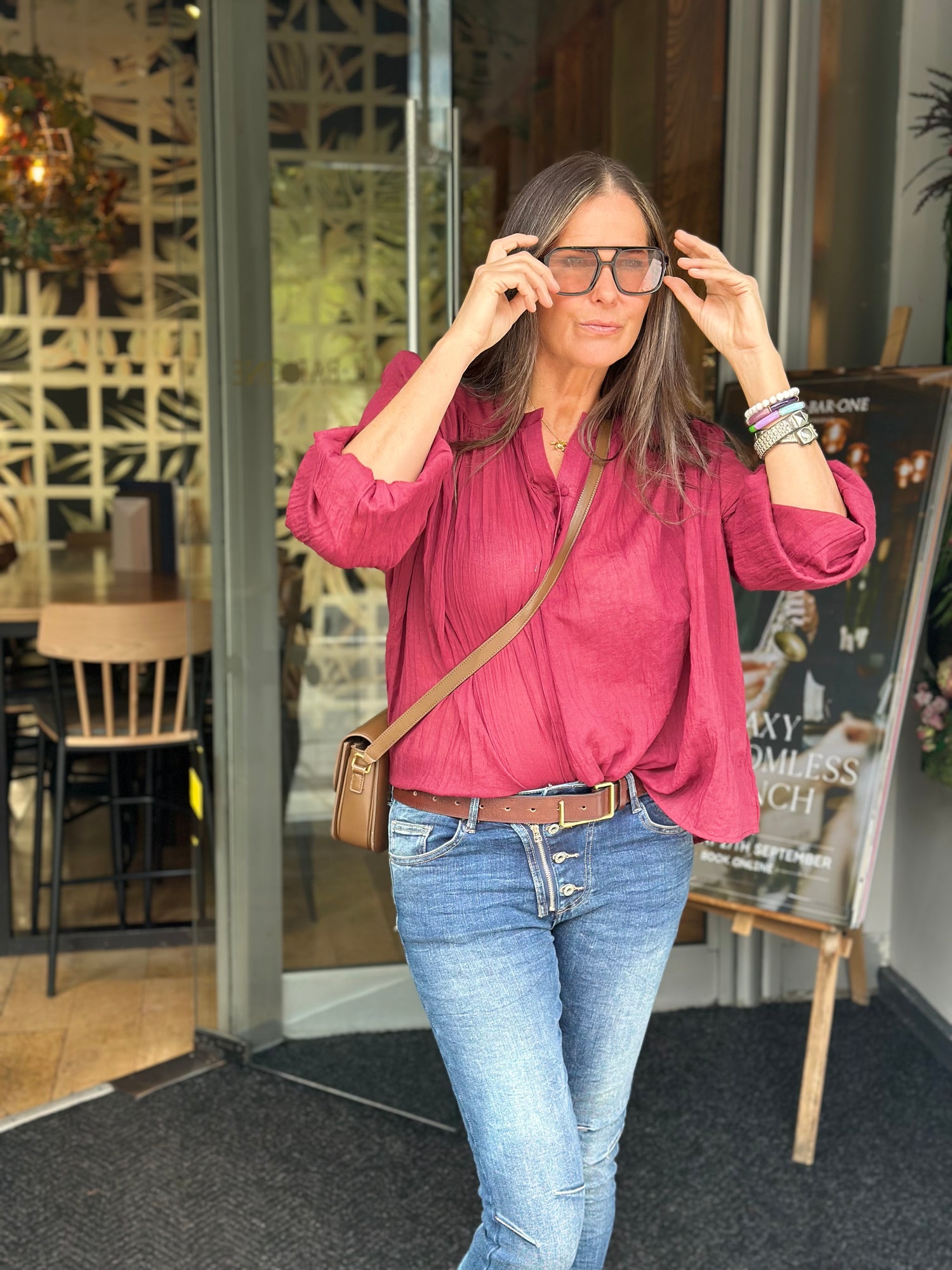The JoJo Floaty Blouse in Chocolate combines sophisticated design with comfortable wearability. Featuring long sleeves and refined button detailing, this blouse offers a polished look suitable for various occasions. Its loose-fitting cut ensures ease of movement and a relaxed silhouette, making it a versatile addition to any wardrobe.