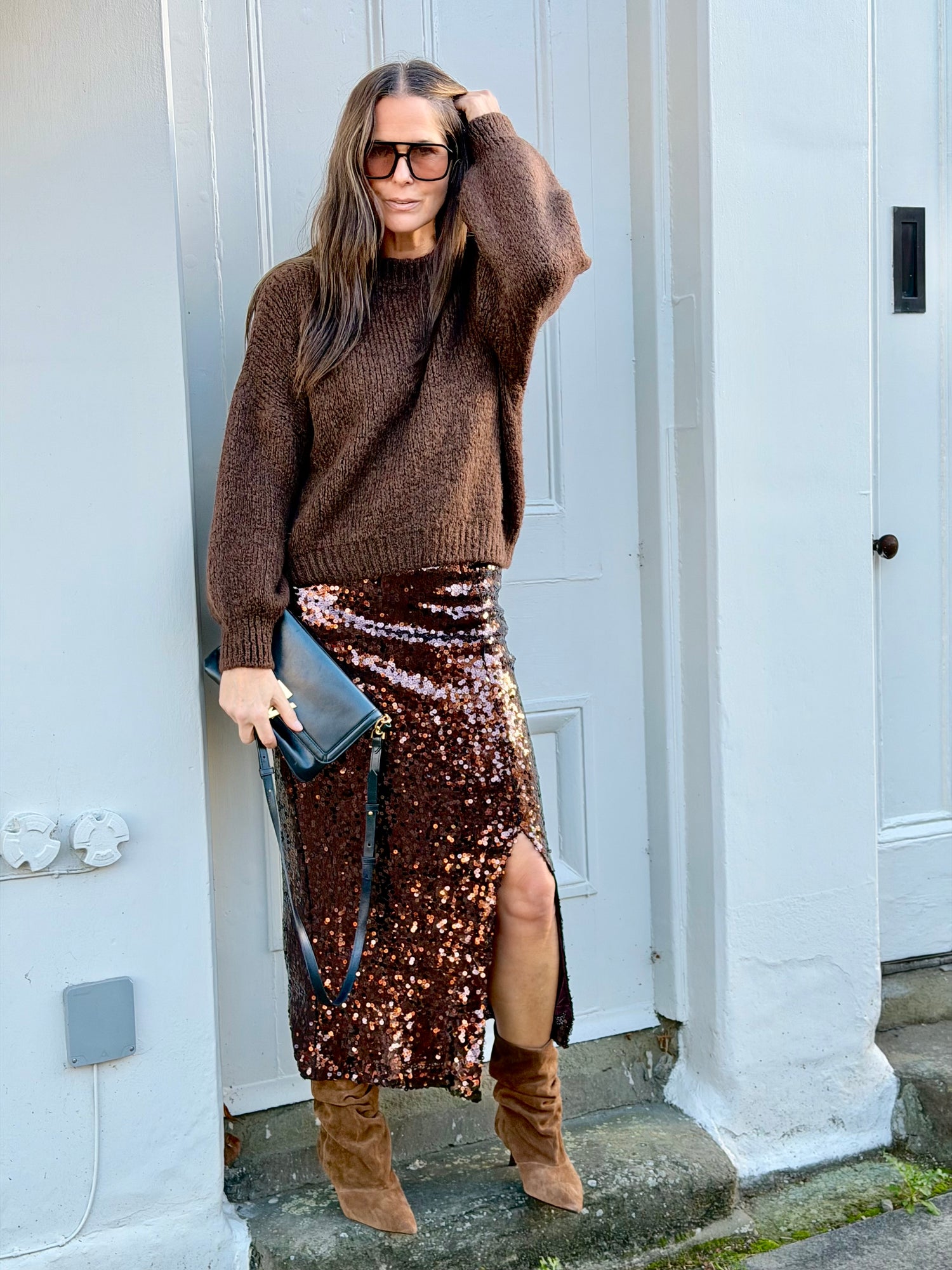 Mariah Sequin Midi Skirt - Chocolate - S is currently sold out. Available for pre-order only.