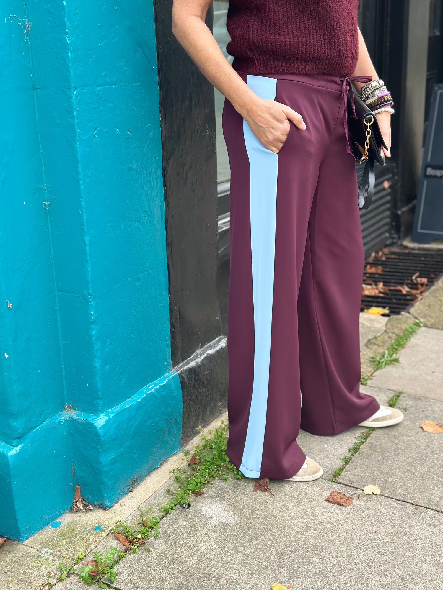 The Aston Pant features a flattering wide-leg silhouette crafted from drapey fabric that moves effortlessly. Designed in a sophisticated claret and blue palette, it offers adjustable comfort with a drawstring waist and practical pockets. Ideal for a polished yet relaxed look, these trousers combine style with everyday functionality.