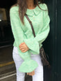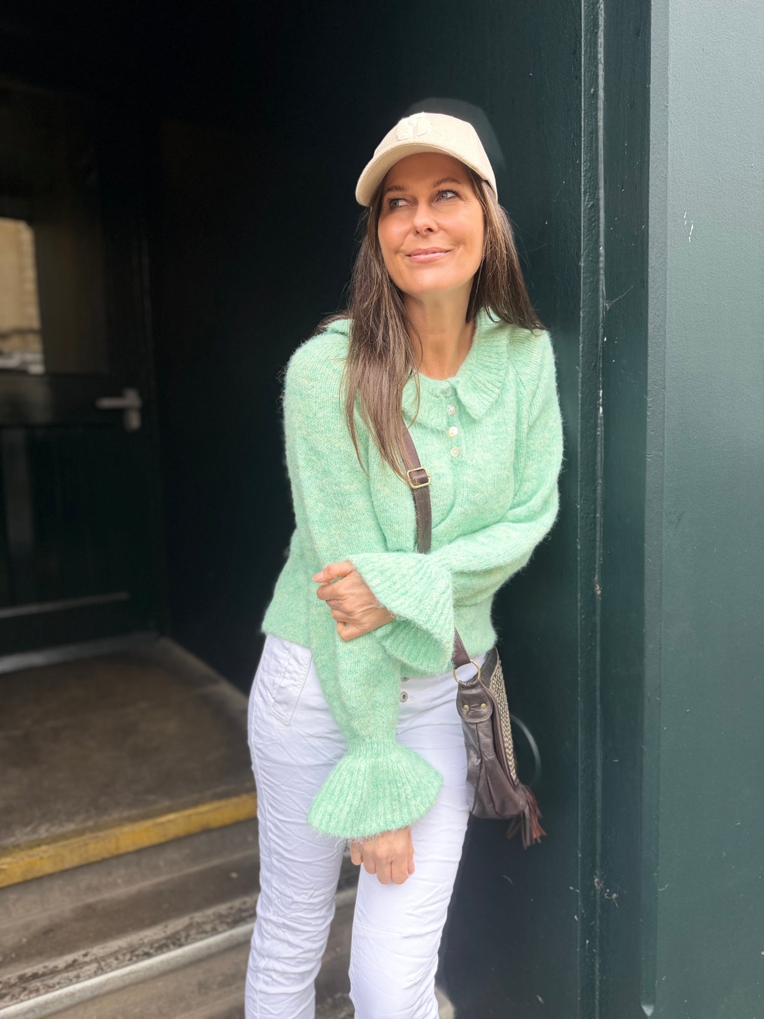 Delicate mint knit with a charming Peter Pan collar and refined button detailing. Puff sleeves add a touch of vintage-inspired elegance whilst maintaining a lightweight construction for everyday comfort. Perfect for layering or wearing solo, this piece brings timeless sophistication to any wardrobe.