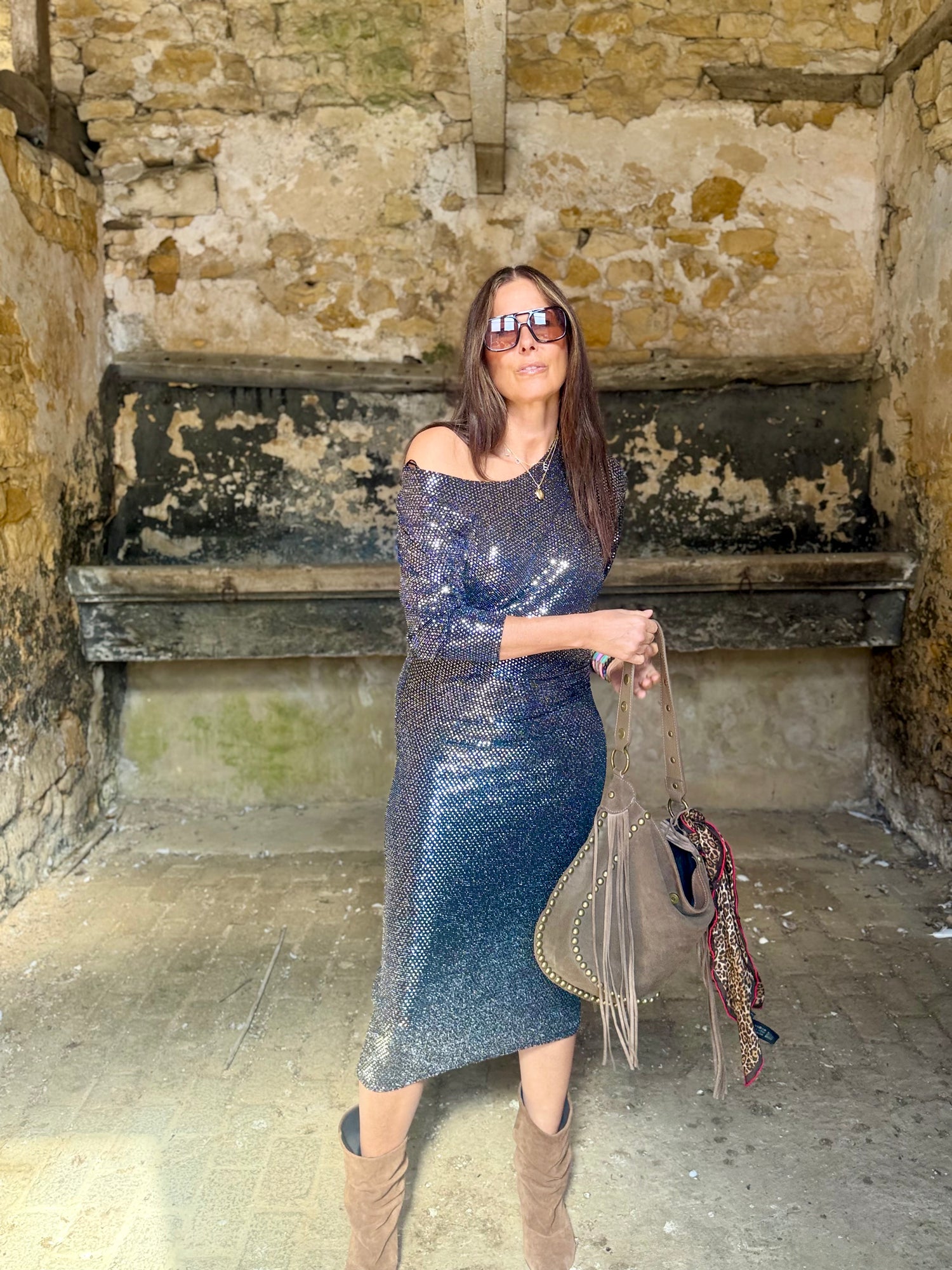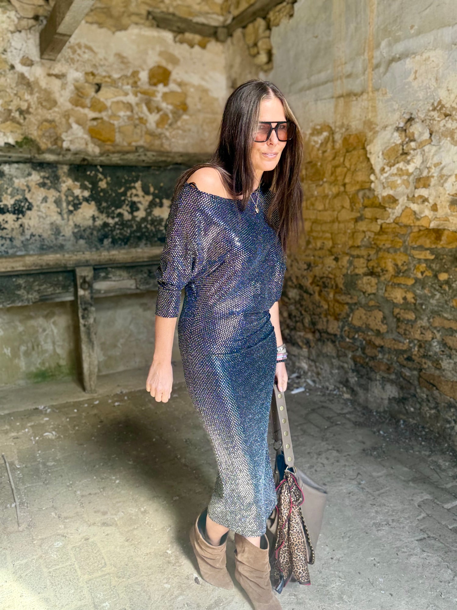 Disco Embellished Midi Dress in shimmering sparkle, designed for versatile styling. This mid-length silhouette flatters the frame with a flattering cut that transitions effortlessly from day to evening. Wear it off the shoulder for a relaxed, contemporary edge or styled traditionally for polished occasions. Perfect for those seeking a dress that moves between occasions with ease and understated glamour.