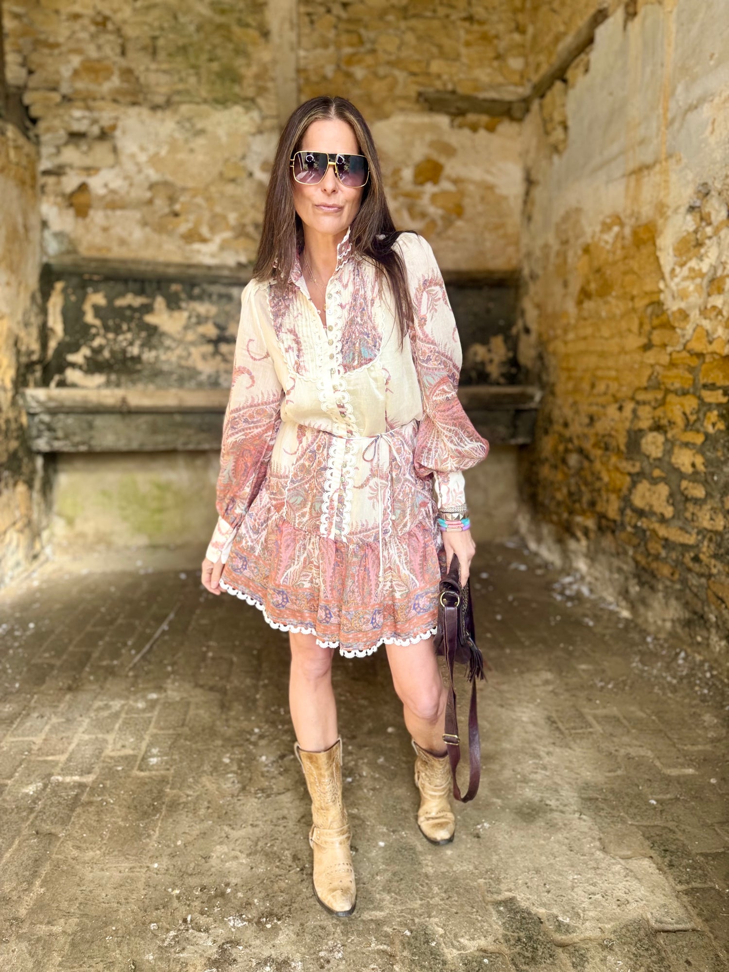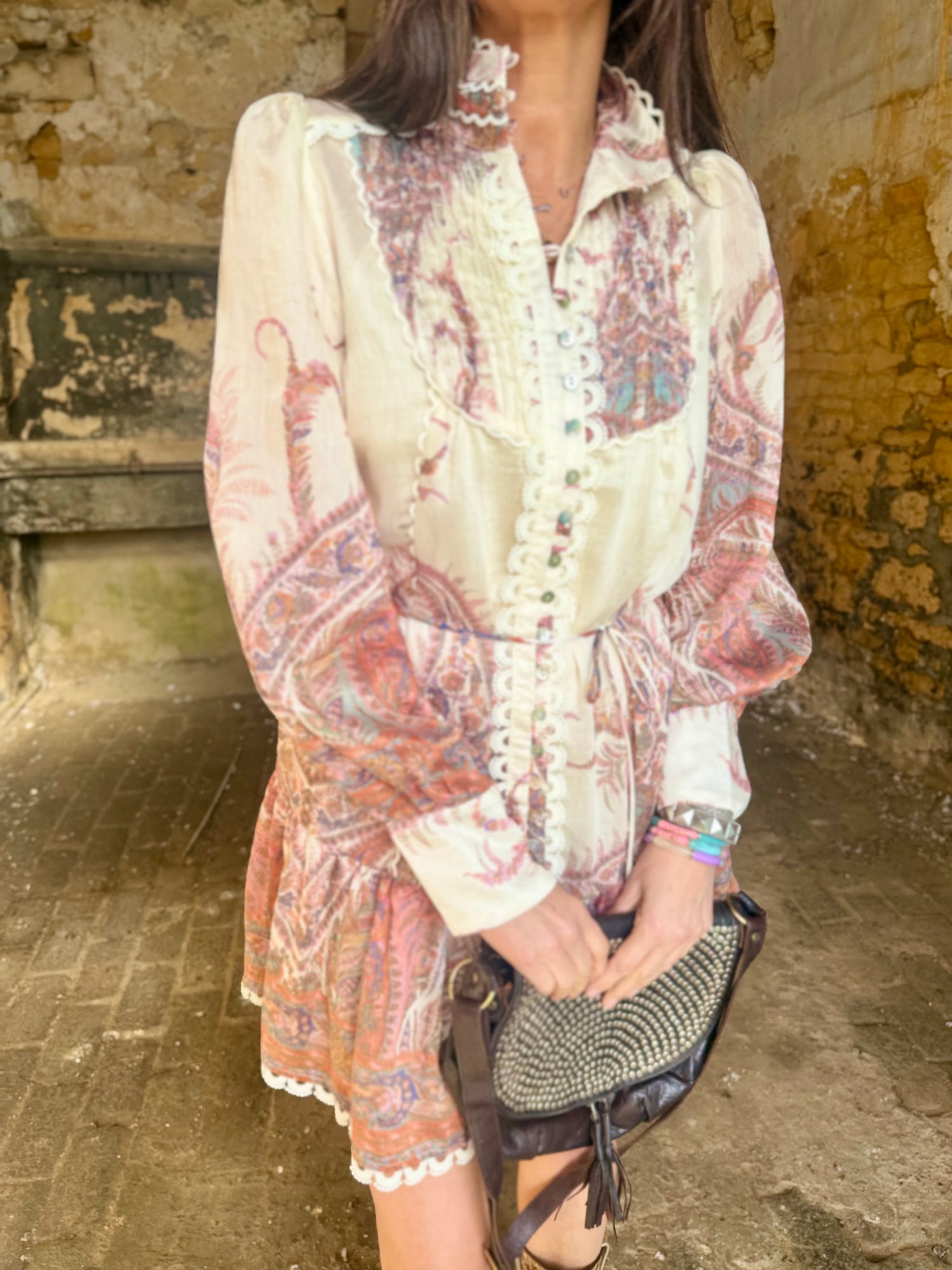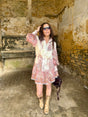 Roxanne Mini Dress features a striking high collar and delicate print, elevated by refined button detailing along the bodice. The tie waist creates a flattering silhouette, allowing you to adjust the fit to your preference. Perfect for occasions where understated elegance meets contemporary design—layer over a slip or wear standalone for versatile styling.