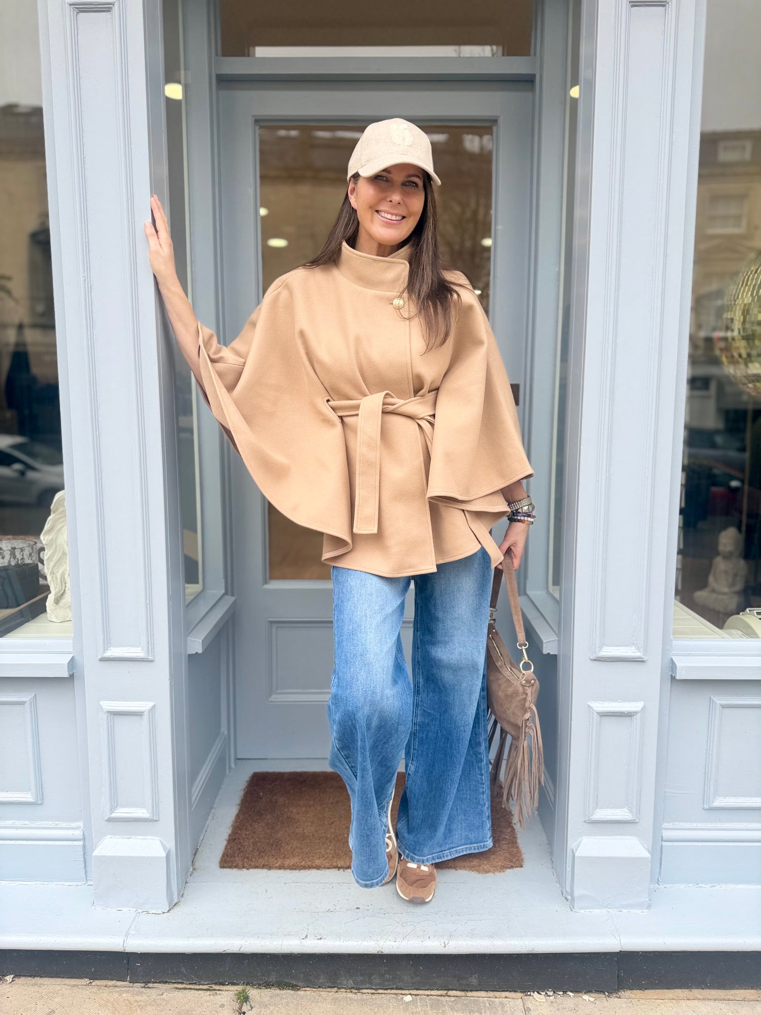 Effortlessly chic and undeniably cosy, this camel tie cape channels cape-inspired elegance with a modern funnel neck silhouette. Perfect for layering through the transitional seasons, it's the on-trend piece that elevates any outfit while keeping you wrapped in warmth. A versatile seasonal essential that bridges spring's unpredictable weather with understated luxury.
