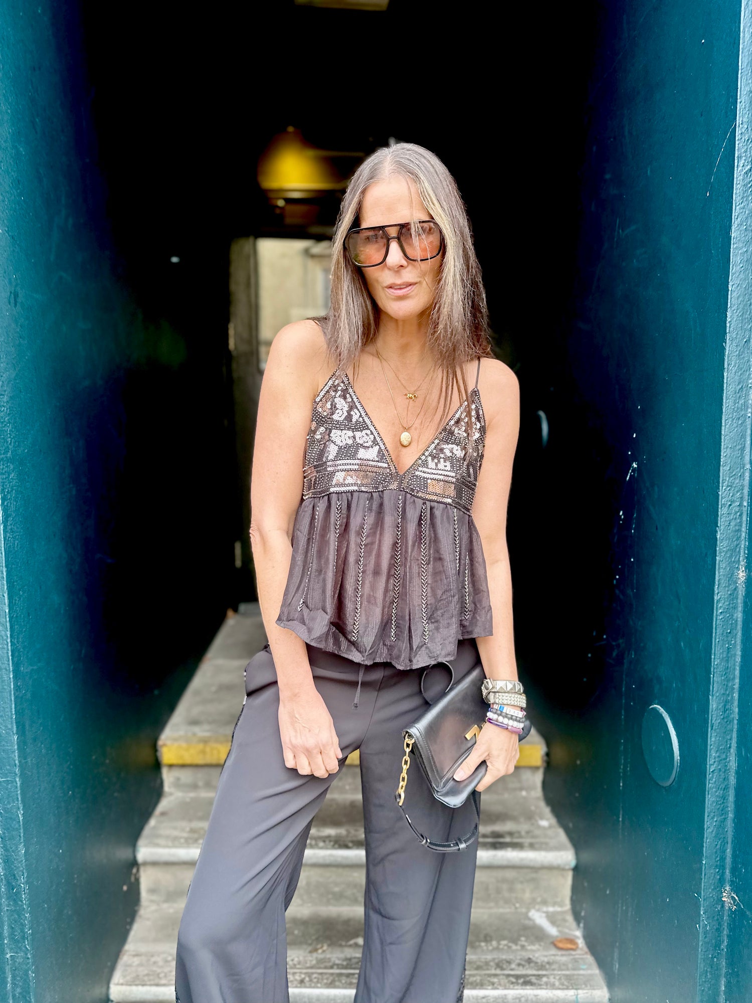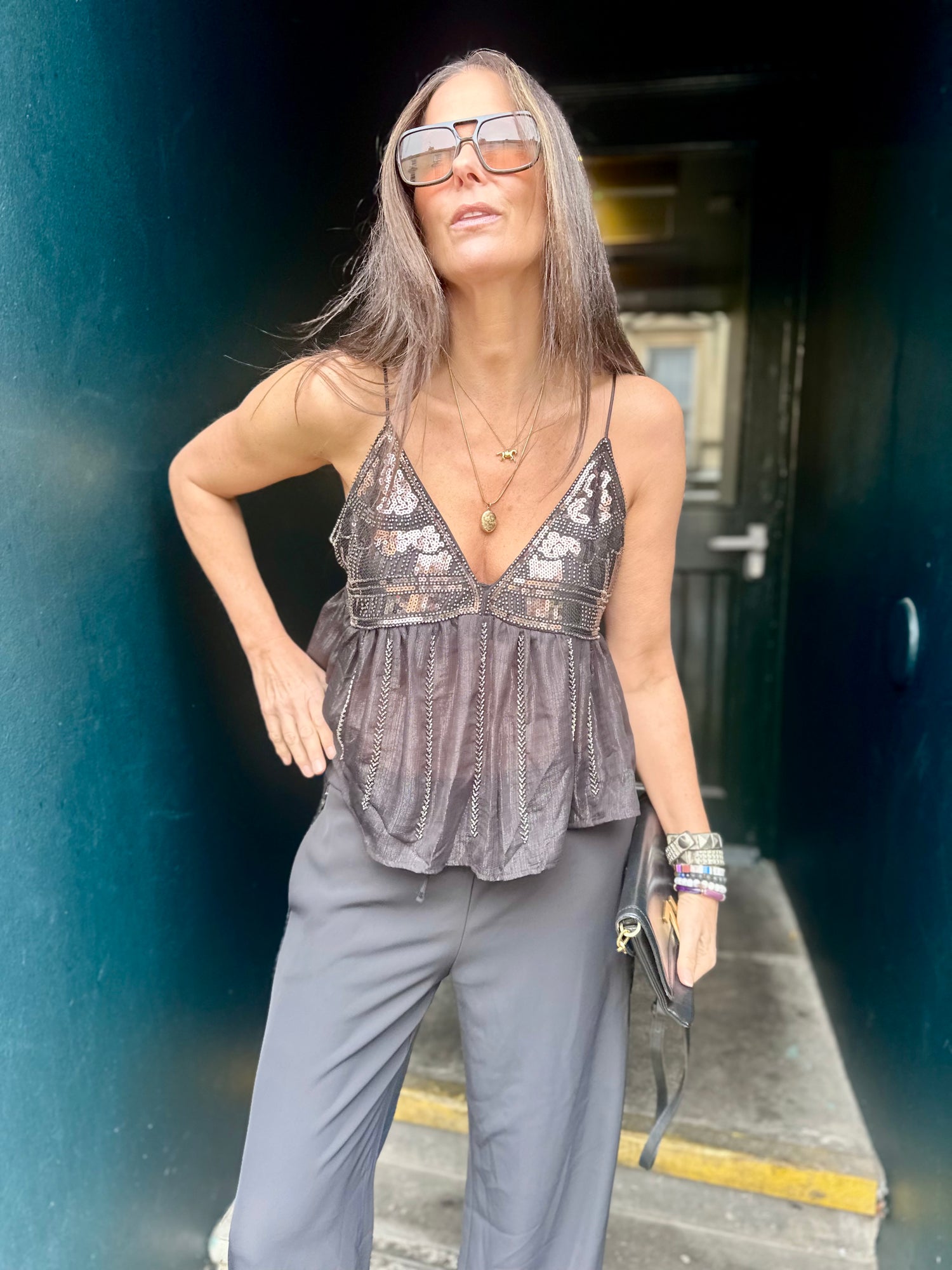 The Liza Sequin Camisole features a floaty, lightweight silhouette enhanced with delicate sequin embellishments for a subtle yet sophisticated shimmer. Crafted with expert attention to detail, this camisole offers graceful draping and refined texture, making it an elegant choice for both casual and formal occasions.