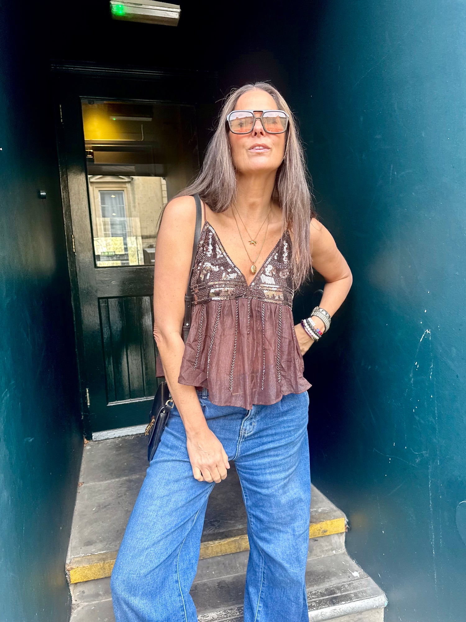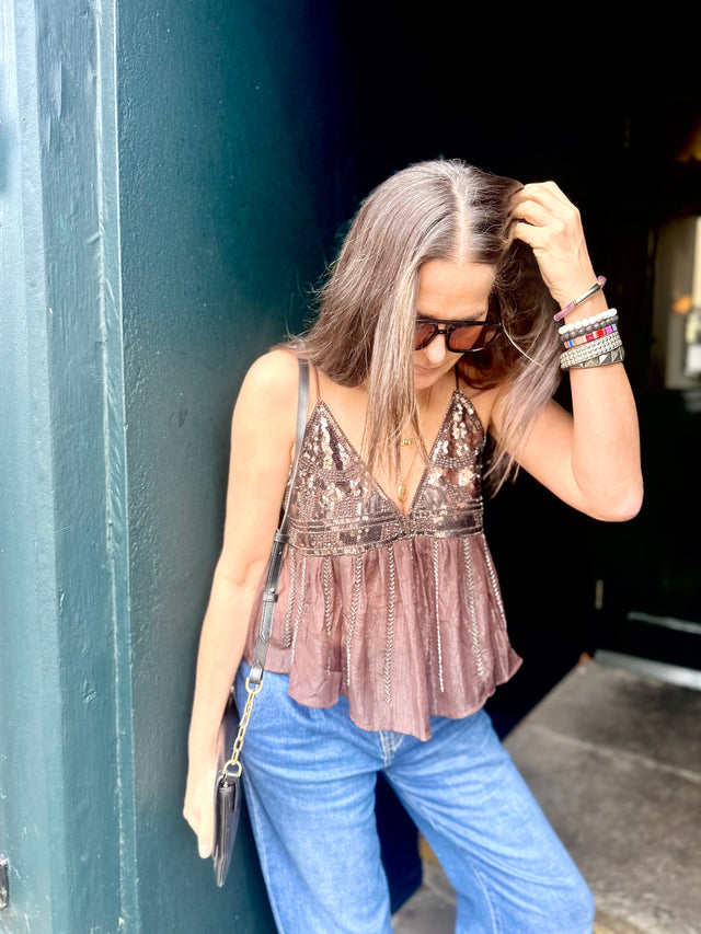 Liza Sequin Camisoles - Chocolate - S/M is currently sold out. Available for pre-order only.