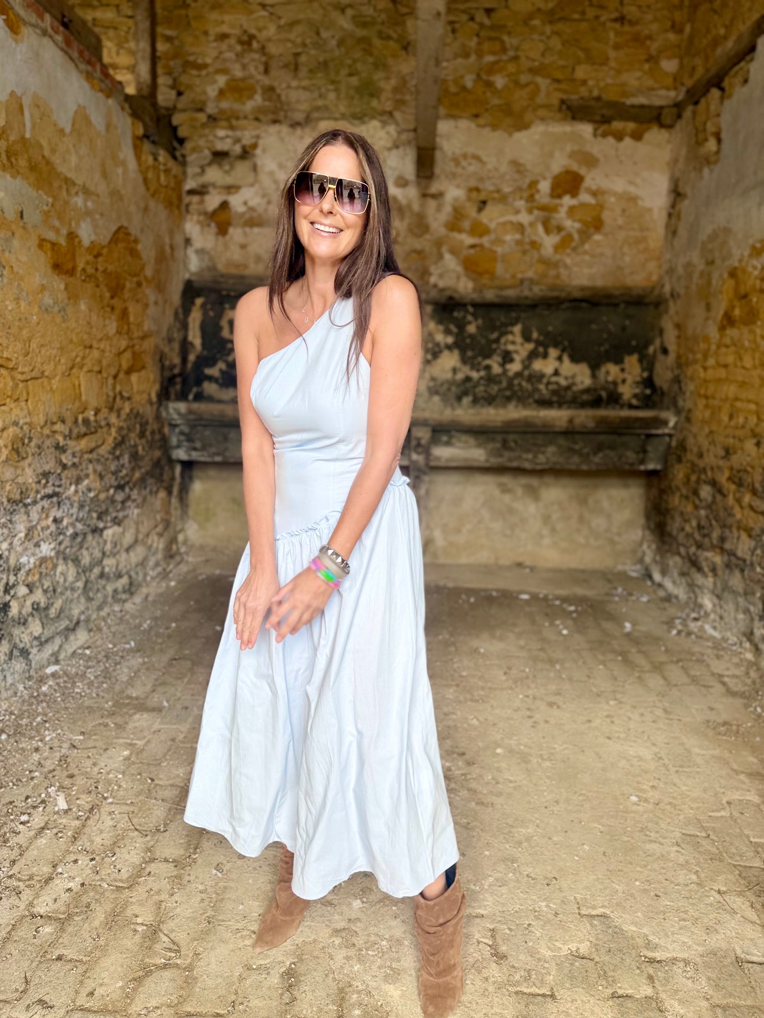 The Louise One Shoulder Dress combines effortless elegance with practical design. This structured midi dress features a striking one-shoulder silhouette that flatters the frame, while a concealed side zip ensures a seamless fit and easy dressing. The tailored construction holds its shape throughout the day, making it ideal for summer occasions from brunch to evening events. Available in three versatile colours, the Louise transitions seamlessly from day to night.