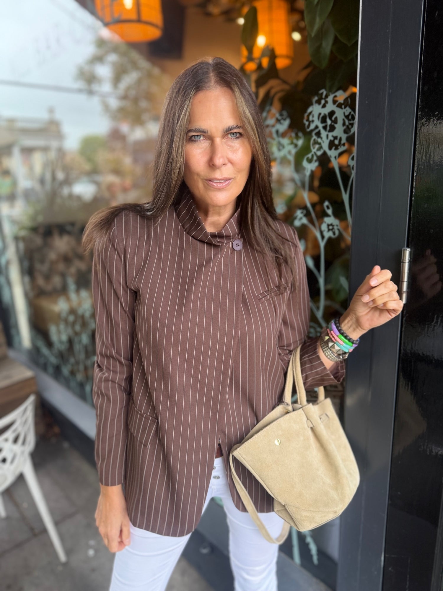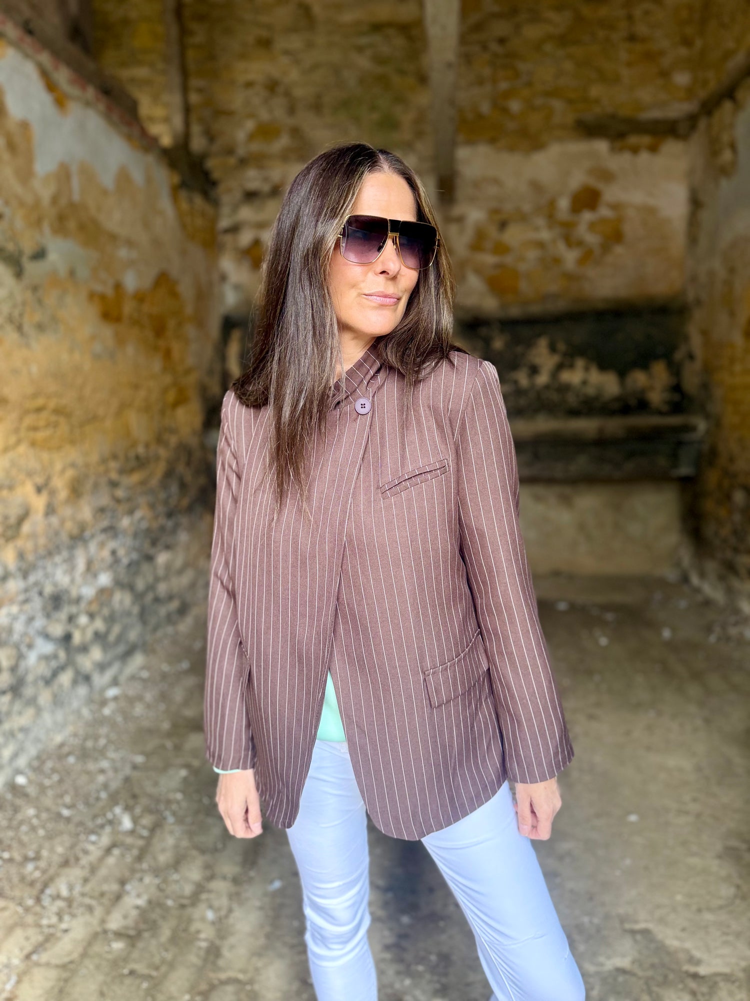 Pinstripe Funnel Neck Blazer - Chocolate