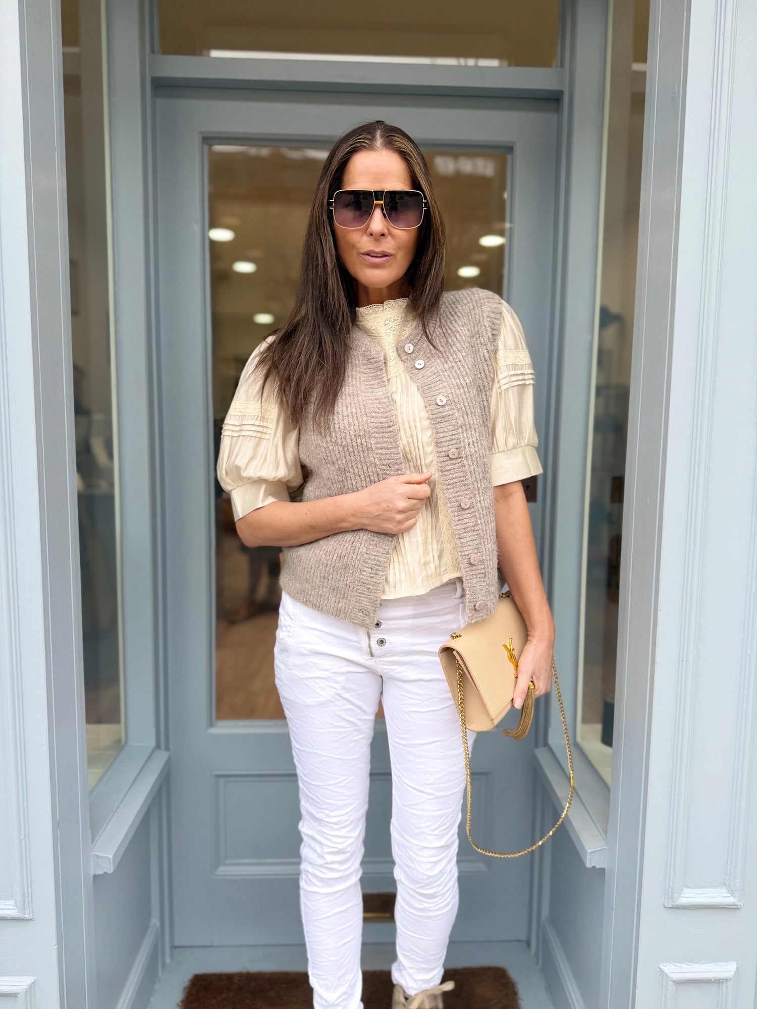 Effortless layering essential with a refined crew neck and button-down front. This sleeveless knitted vest transitions seamlessly from office to weekend, offering versatile styling over shirts, dresses, or knitwear. One-size fit ensures accessible luxury for your wardrobe staple.