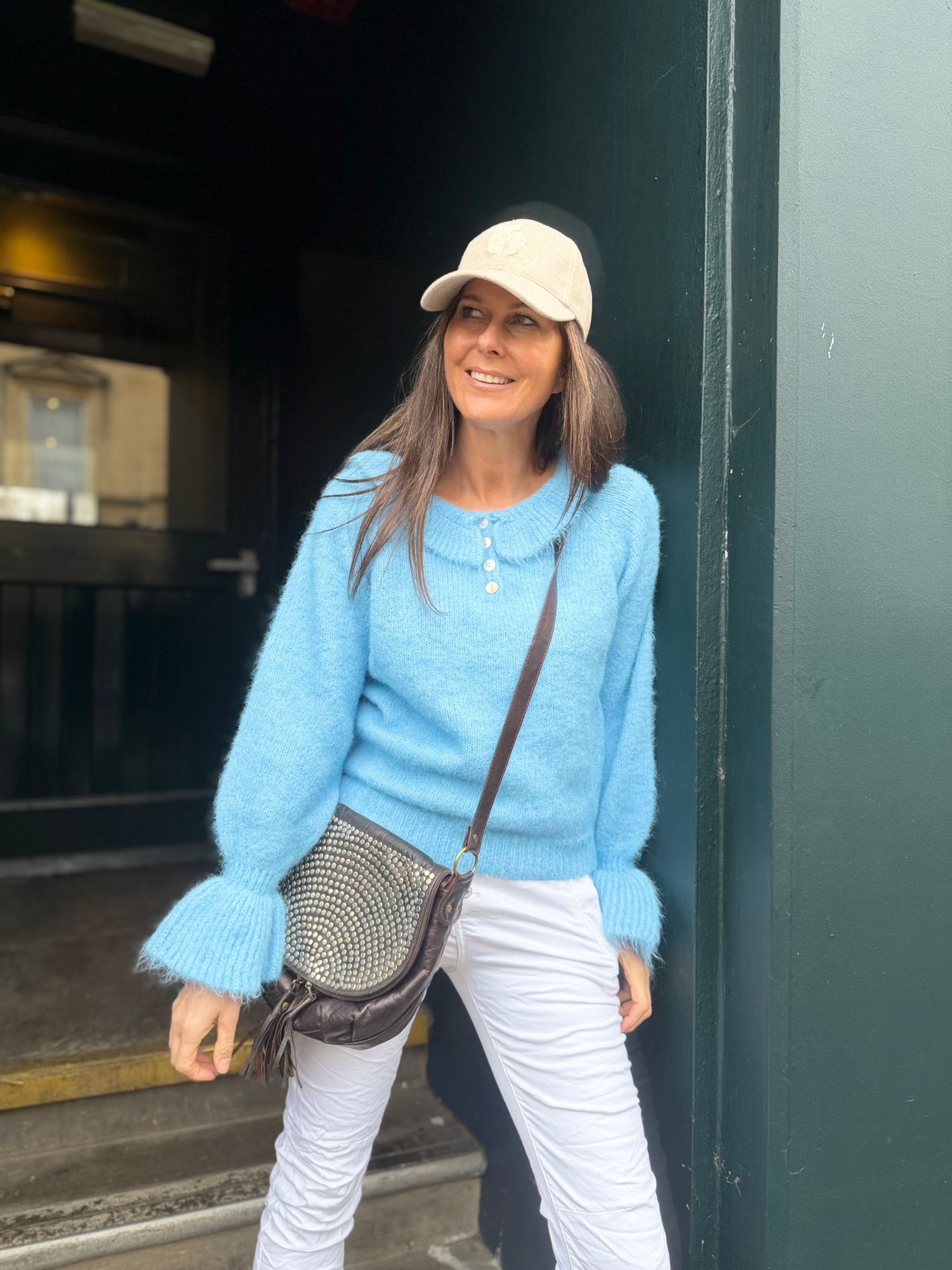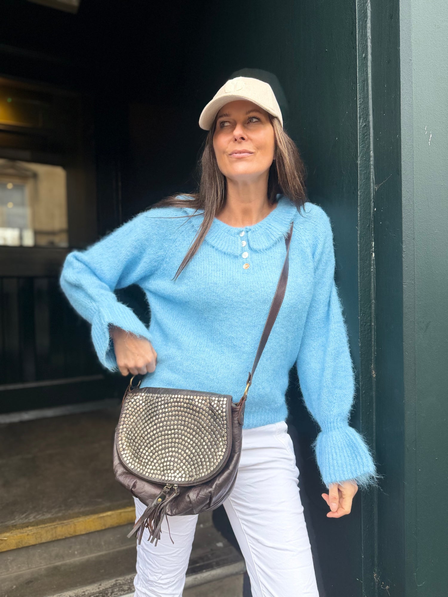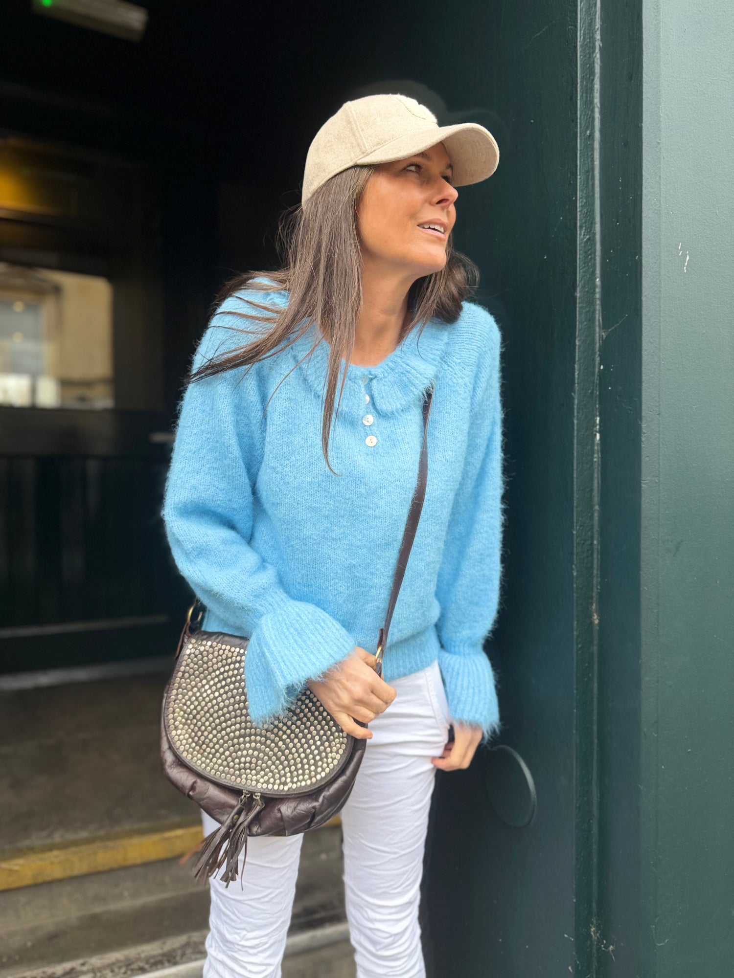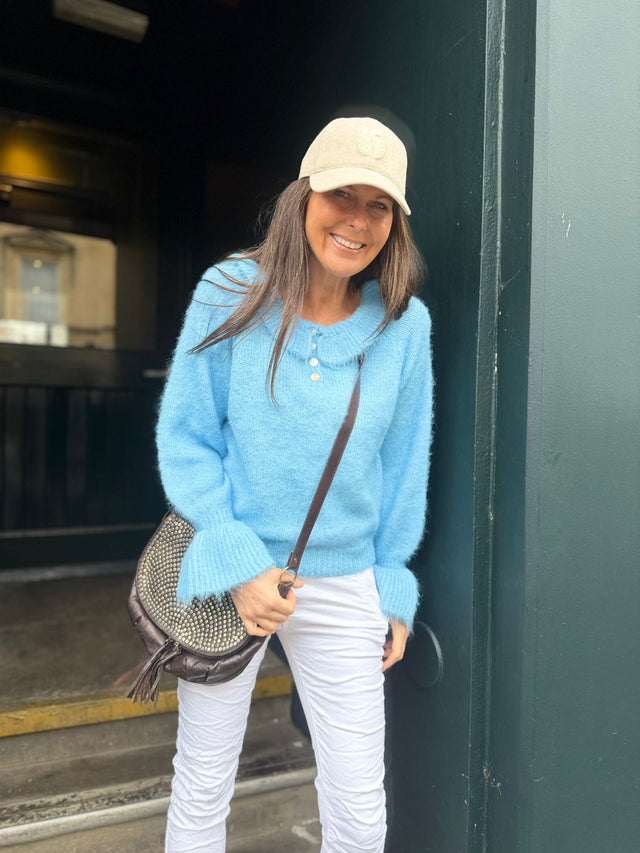 Delicate baby blue knit with a charming Peter Pan collar and refined button detailing. Puff sleeves add a touch of vintage-inspired elegance whilst maintaining a lightweight construction for everyday comfort. Perfect for layering or wearing solo, this piece brings timeless sophistication to any wardrobe.