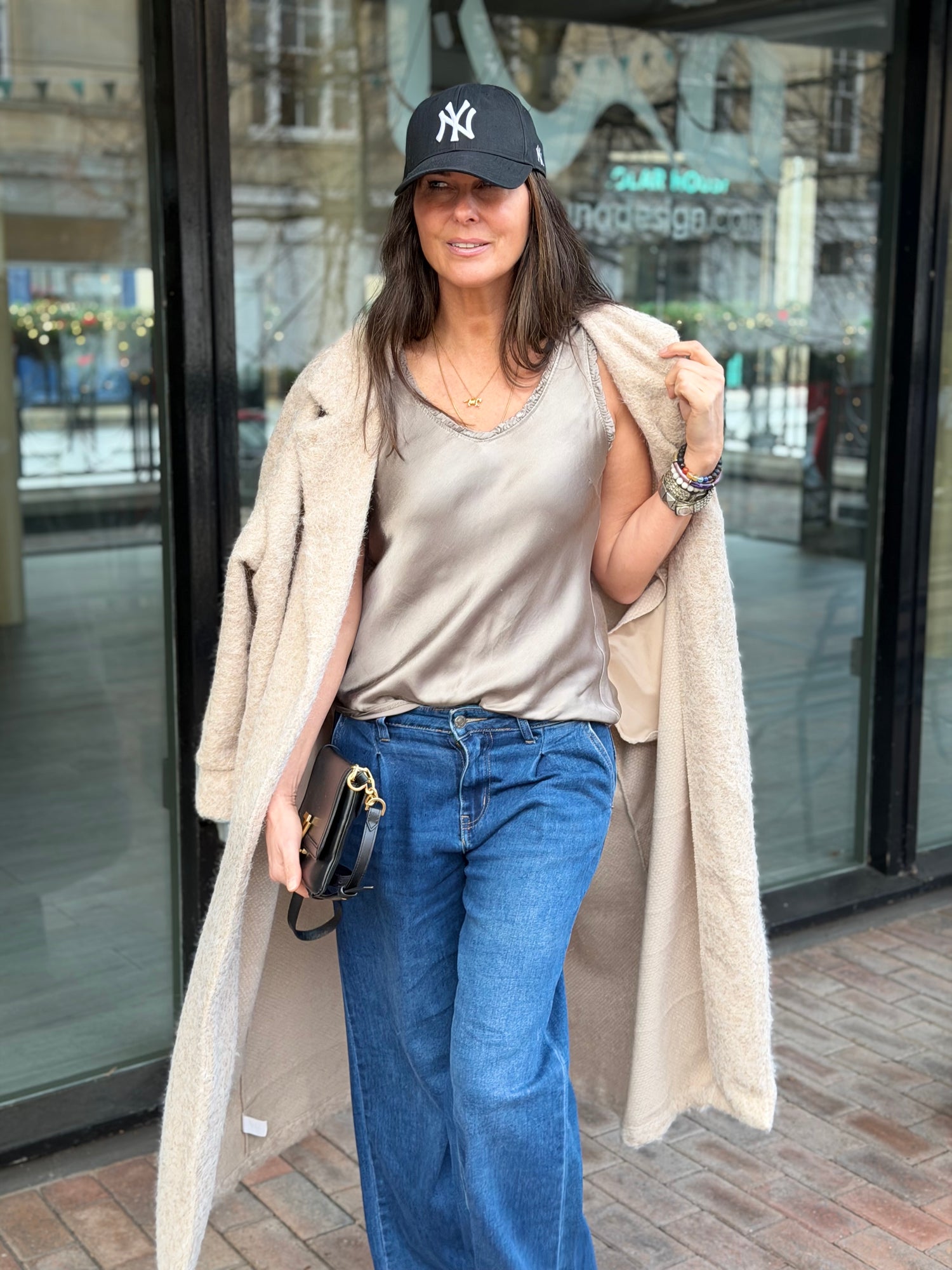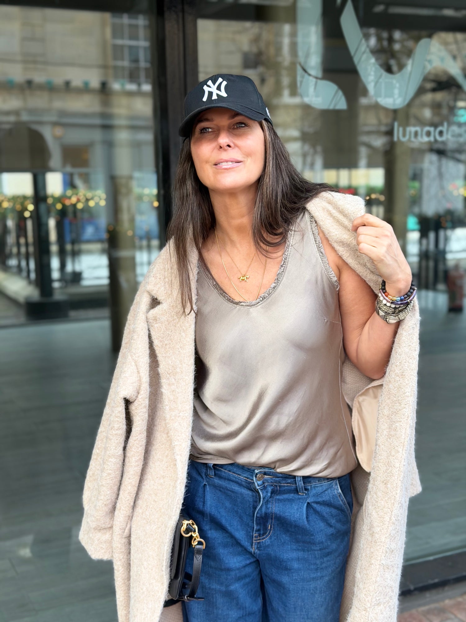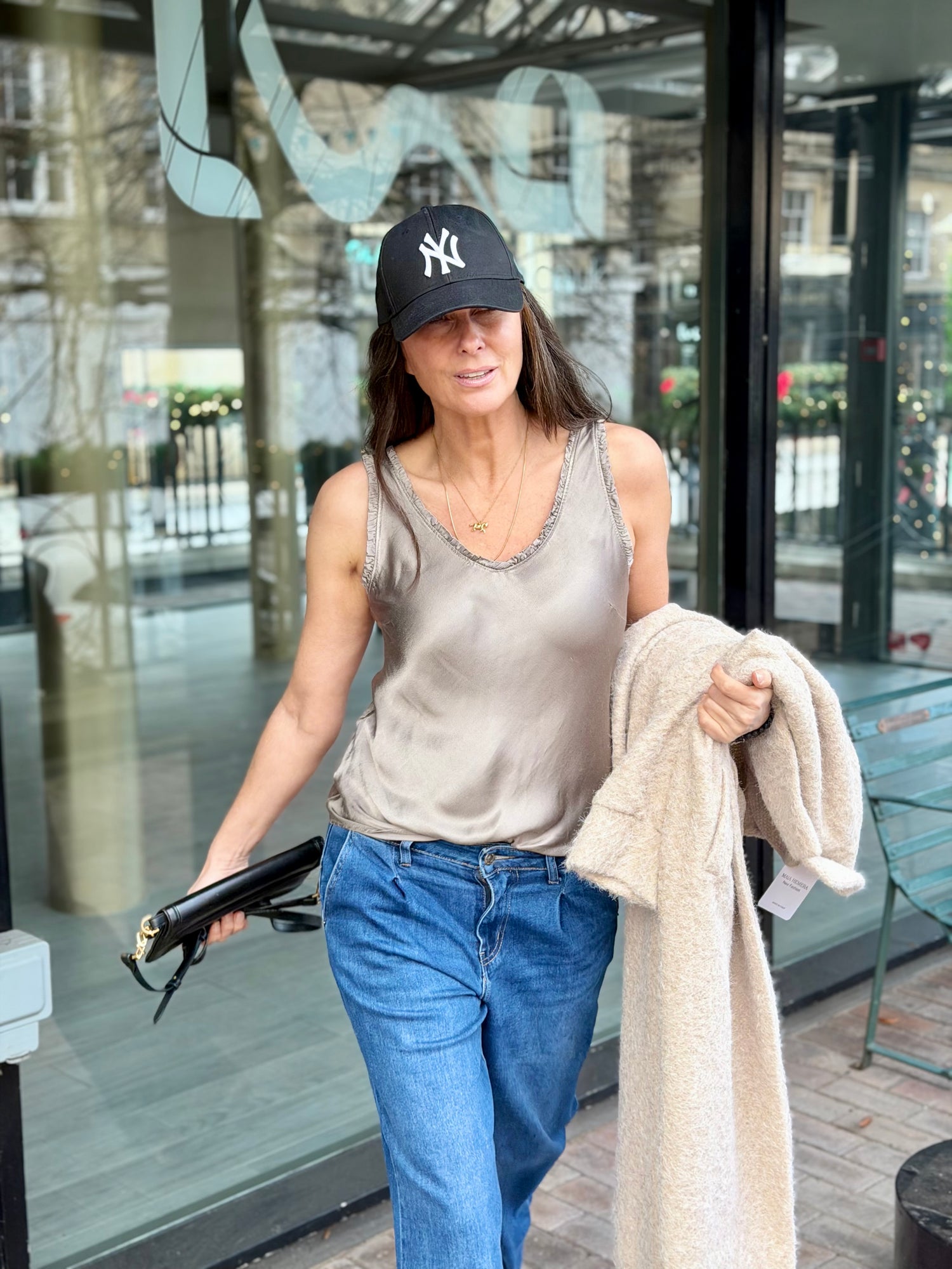 Delilah Silky Tank This refined silky tank features a graceful V-neckline and whisper-soft construction that drapes beautifully against the skin. Signature frilled trim adorns the straps, adding a touch of feminine sophistication. The luxurious fabric ensures comfort and versatility—wear it layered under blazers for polished workwear or solo for understated evening appeal.